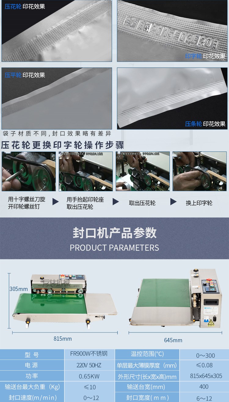 FR-900W全自动封口机,可以输送台加宽至400mm,承重加至10kg适用大米袋等较大较重产品封口。