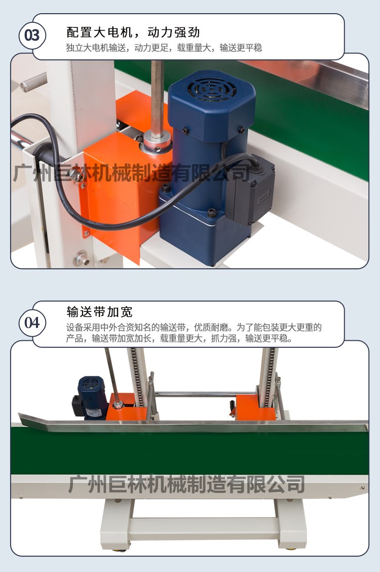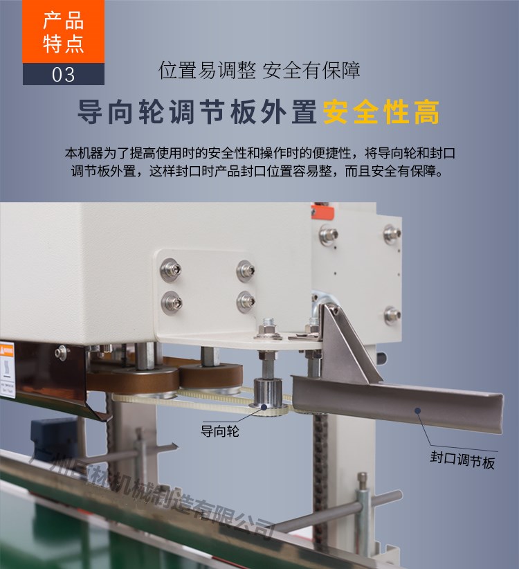 7包装物进入输送台时必须贴着护栏,包装袋口一旦被引导带拖入后,输送带与封口传动同步进行封口包装,此时请不要对包装物任意推动或阻挡,以免造成封口效果不良。